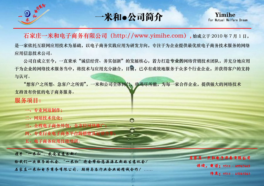 石家莊一米和電子商務(wù)有限公司(http://m.42390.cn),始成立于2010年7月1日,是一家依托互聯(lián)網(wǎng)應(yīng)用技術(shù)為基礎(chǔ),以電子商務(wù)實(shí)踐應(yīng)用為研發(fā)方向,專注于為企業(yè)提供優(yōu)質(zhì)電子商務(wù)技術(shù)服務(wù)的網(wǎng)絡(luò)應(yīng)用信息技術(shù)公司。
